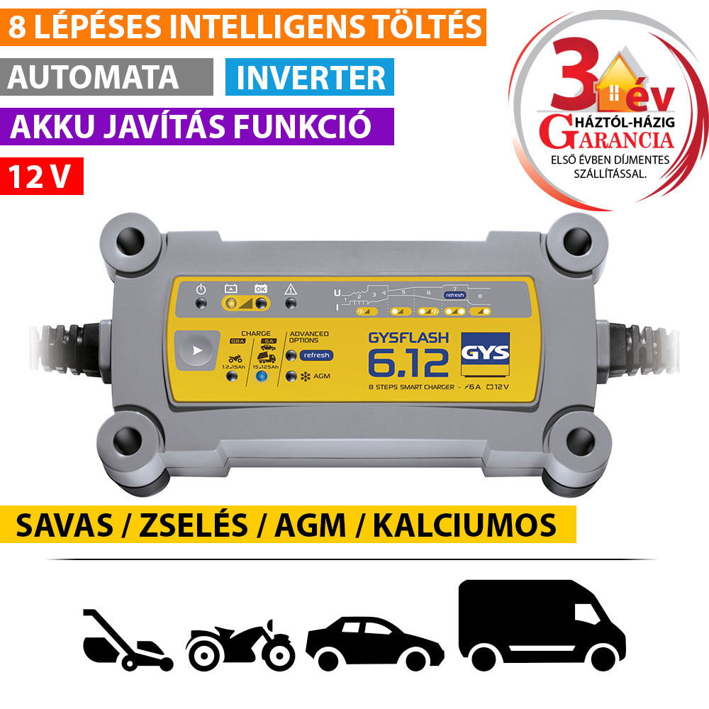 Kifejezetten haszongépjárművek, motorok, jet-skik és minden fajta személyautó 12V-os akkumulátorának töltésére fejlesztették ki, a GYSFLASH 6.12 8 lépéses, intelligens töltésgörbével rendelkezik, ami optimális és 2-szer olyan gyors töltést garantál, mint egy hagyományos 6A-es akkumulátortöltő.